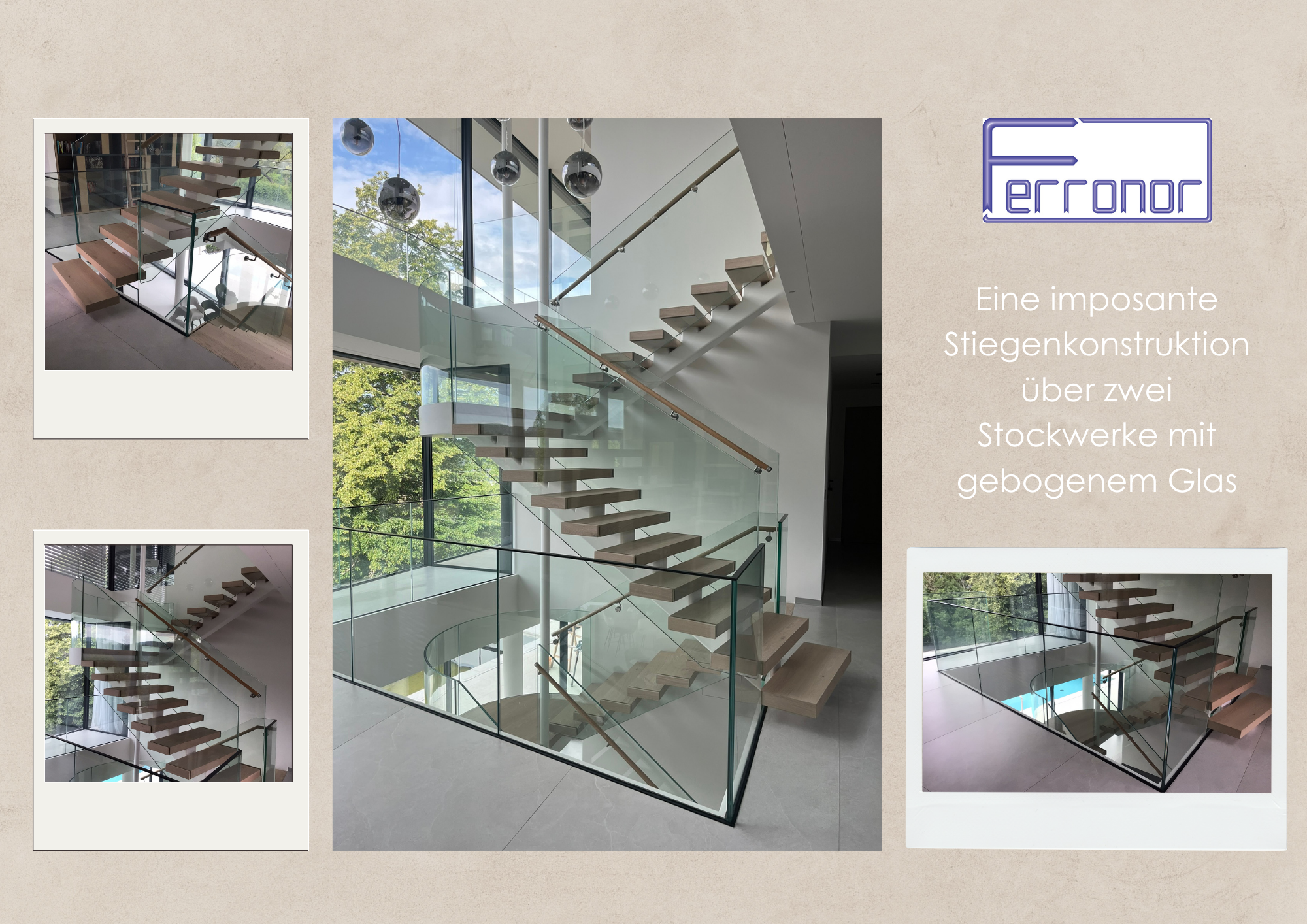 Eine grandiose Stiegenkonstruktion über zwei Stockwerke mit gebogenem Glas und mit vielen Detailwünschen, die der Konstruktion ein besonderes „Extra“ verliehen haben. Der Kunde hat große Freude mit der Stiege.